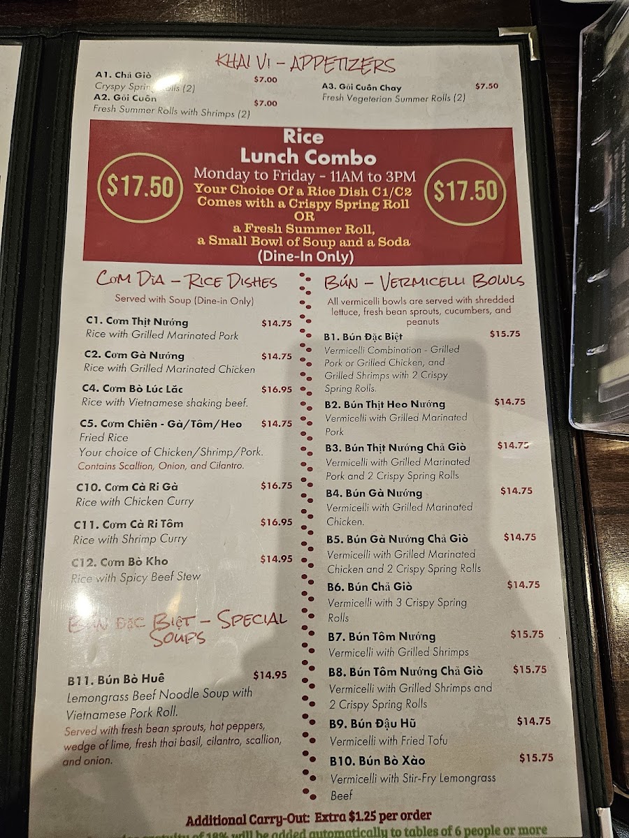 The menu features a variety of traditional pho options, including classic choices like the Regular Pho starting at $12.95 and the Super Pho at $14.95, perfect for meat lovers with slices of eye round steak, tender brisket, and more. For a midweek treat, try the Lunch Combo that offers a satisfying pho with a crispy or fresh spring roll and a soda for just $15.95.